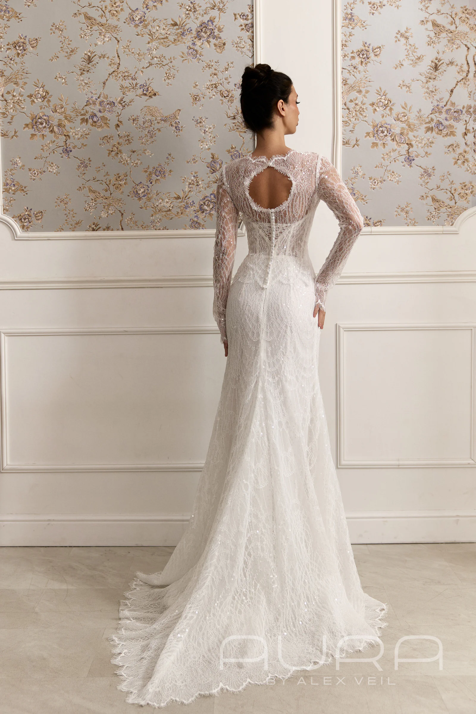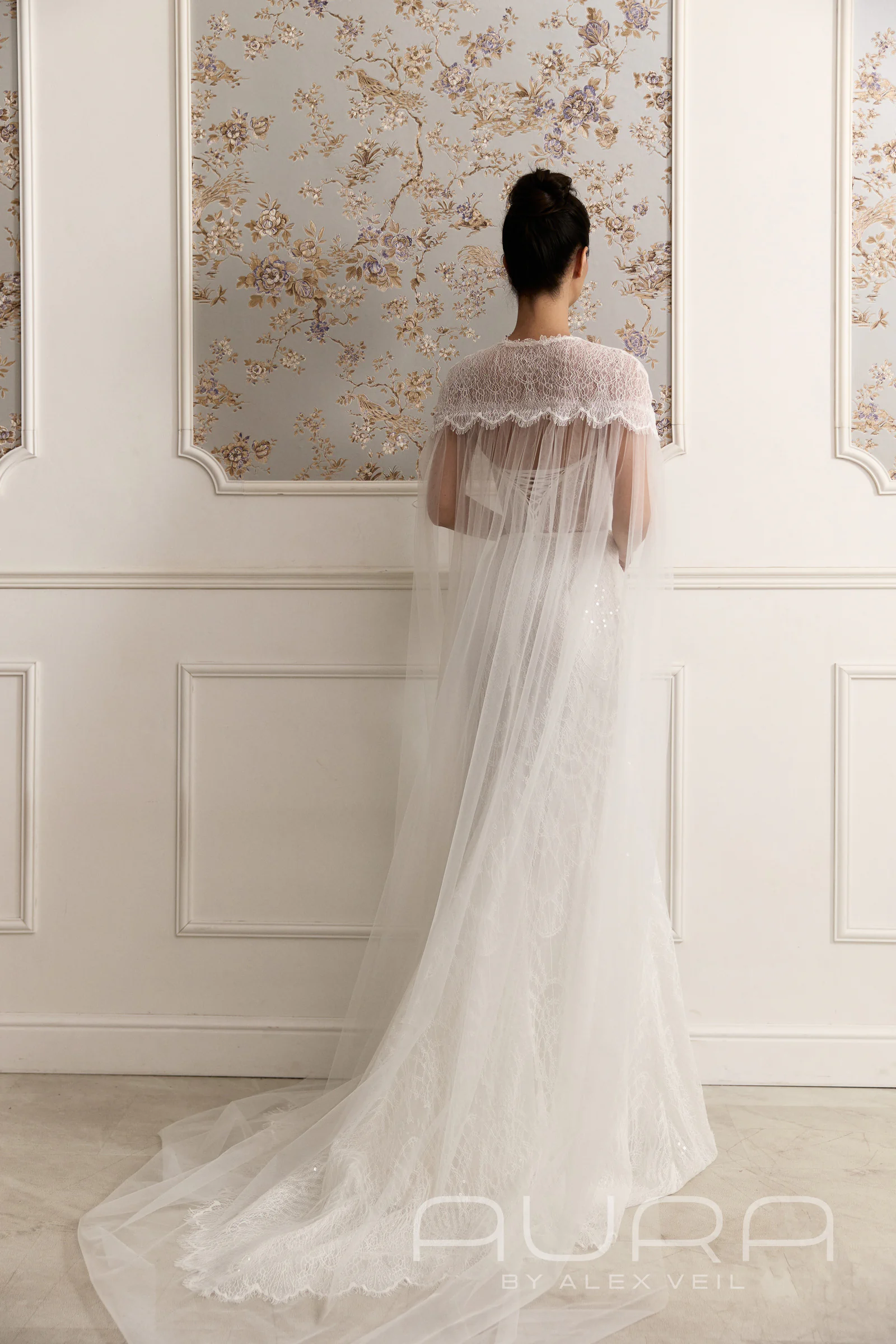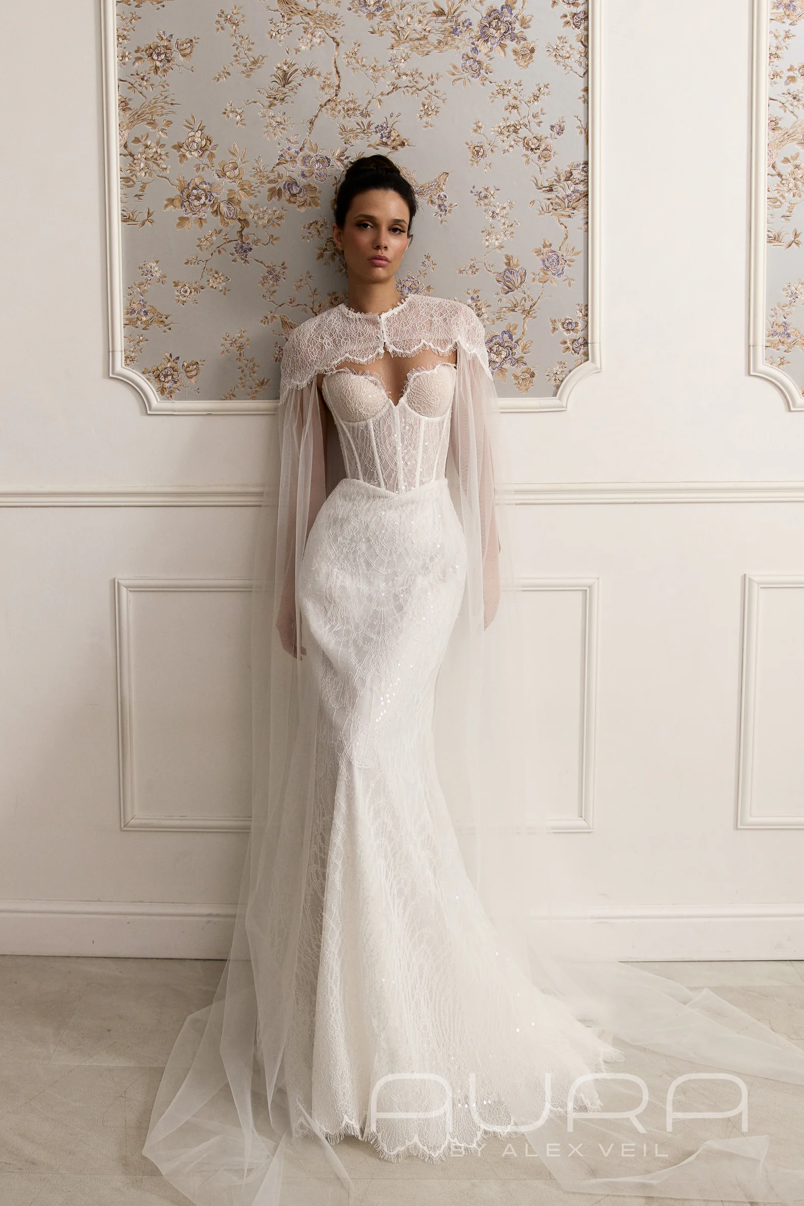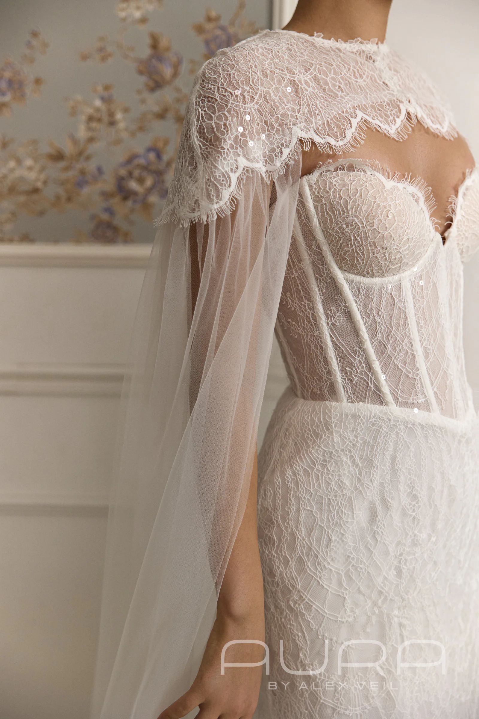 - Эффект 3-в-1. В комплекте с платьем идет съемное кружевное болеро с длинными рукавами и высокой горловиной. Это позволяет за минуту превратить открытый вечерний образ в более сдержанный и закрытый, что идеально подойдет для торжественной церемонии. А если захочется добавить образу «летящий» эффект, платье можно дополнить кейпом из того же кружева (доступен опционально), который заменит традиционную фату.