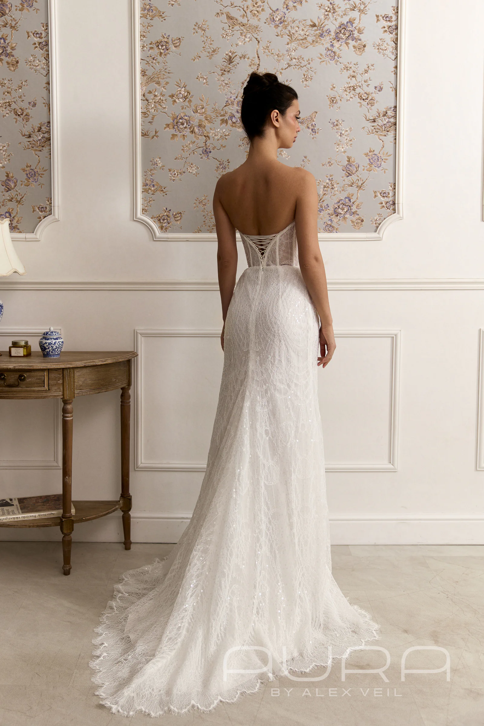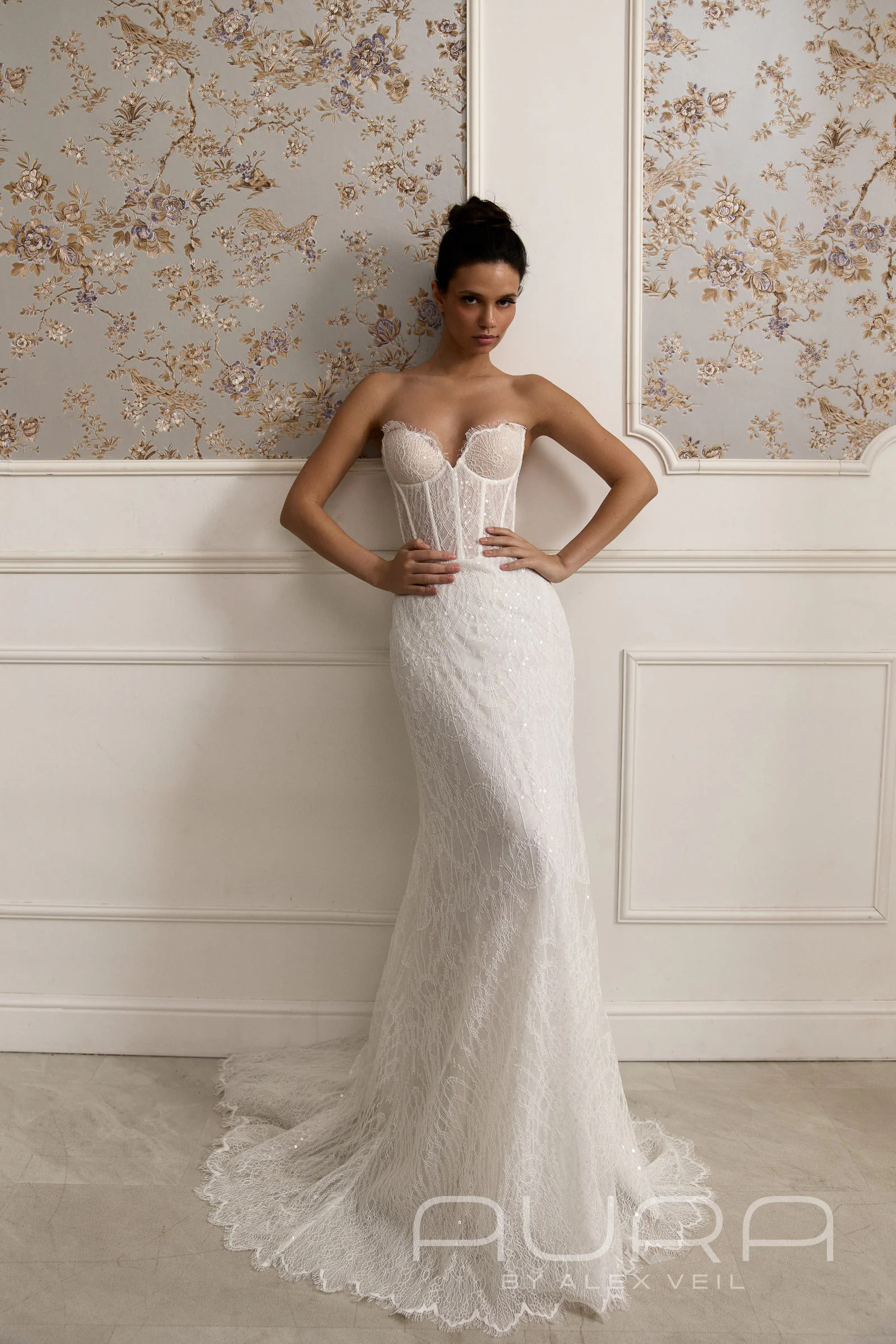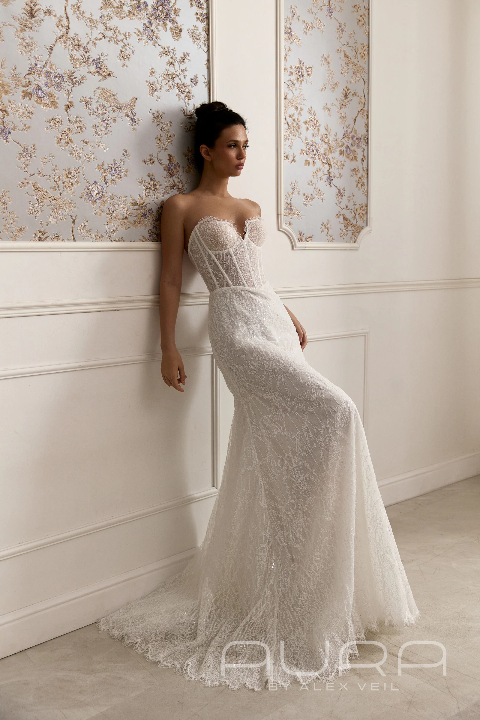 Платье Alizel — это сочетание чувственного силуэта «рыбка» и сложной, богатой структуры материалов. Эта модель сочетает смелость корсета ‘бюстье’ и элегантную классикой кружева.