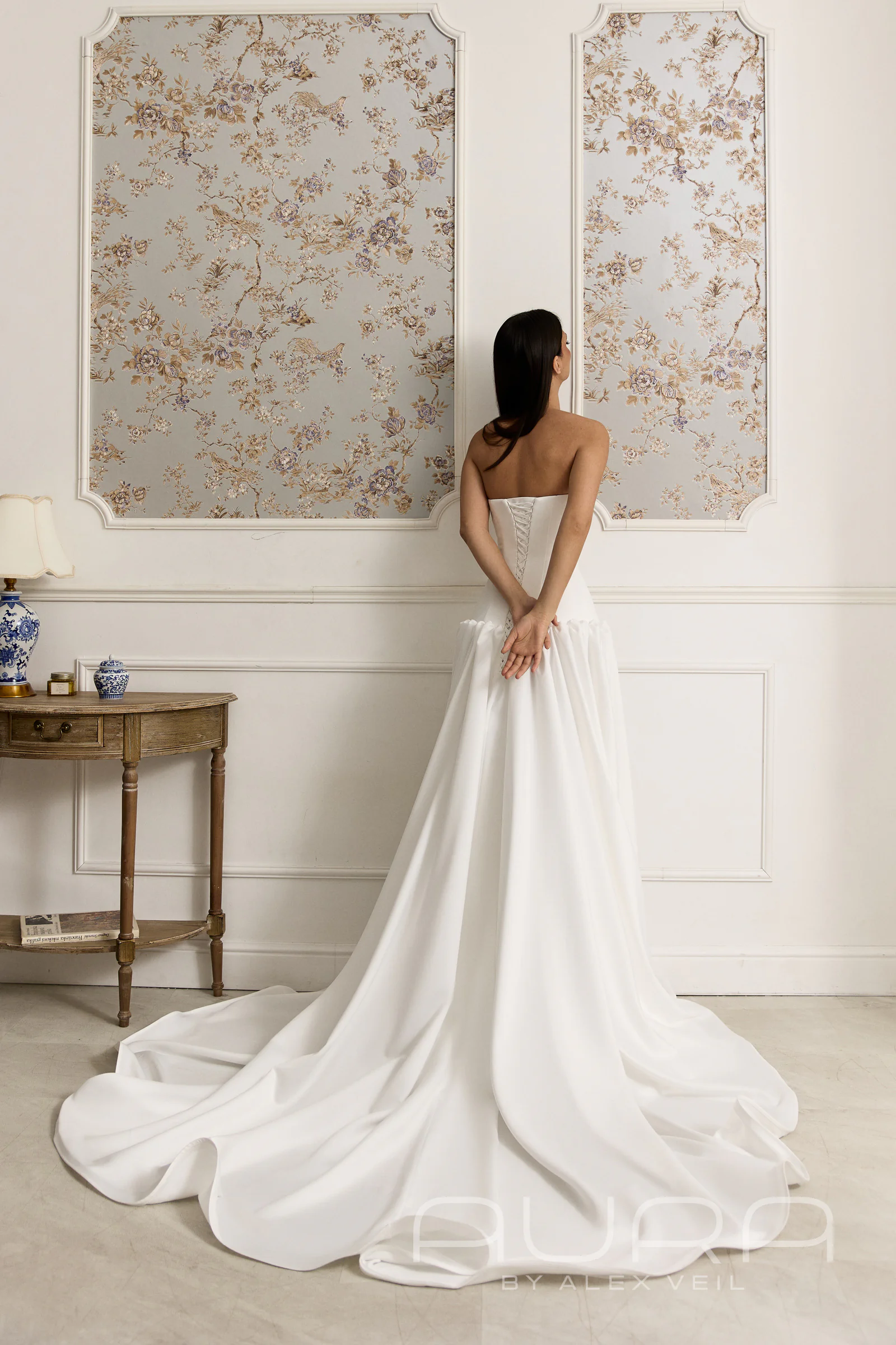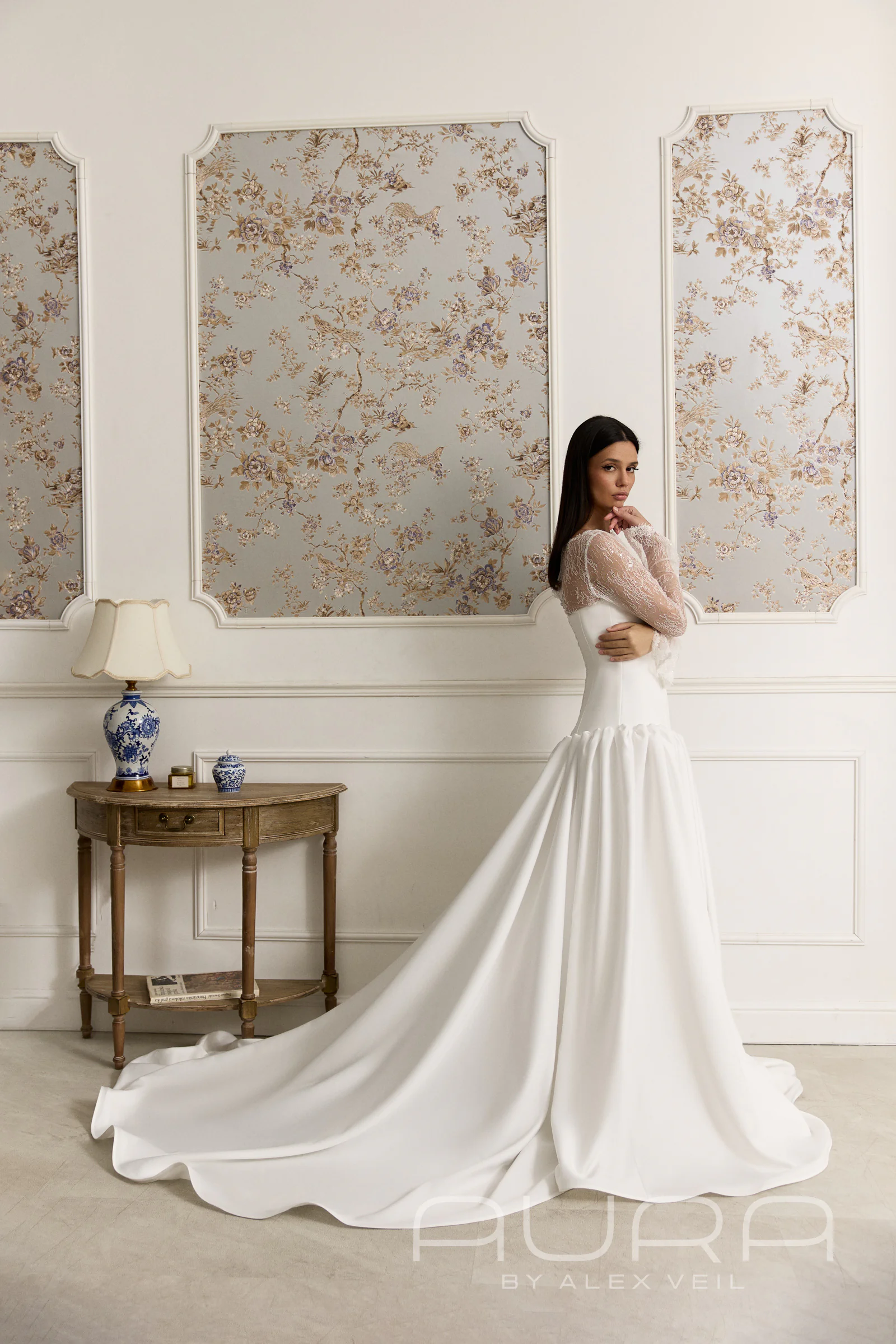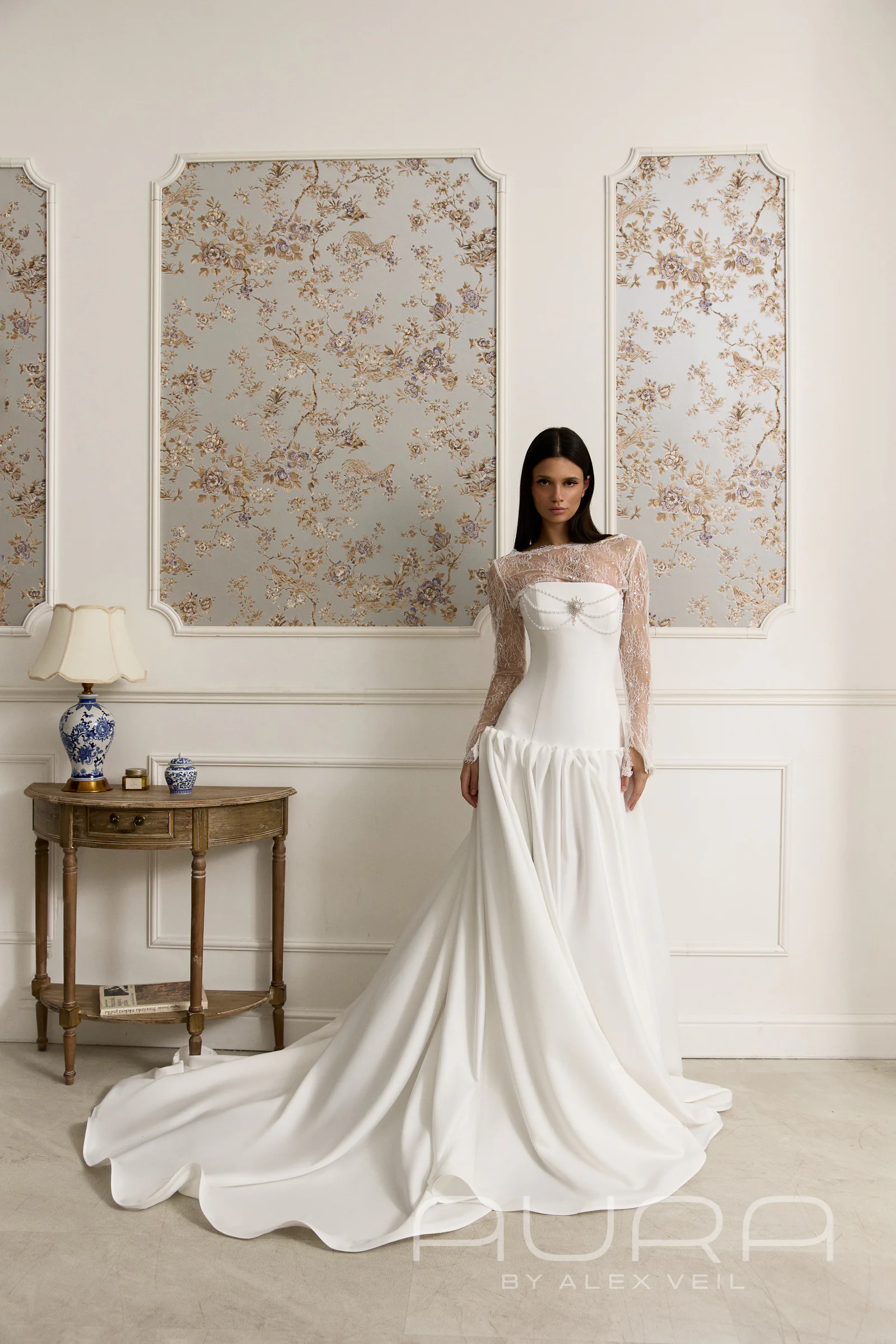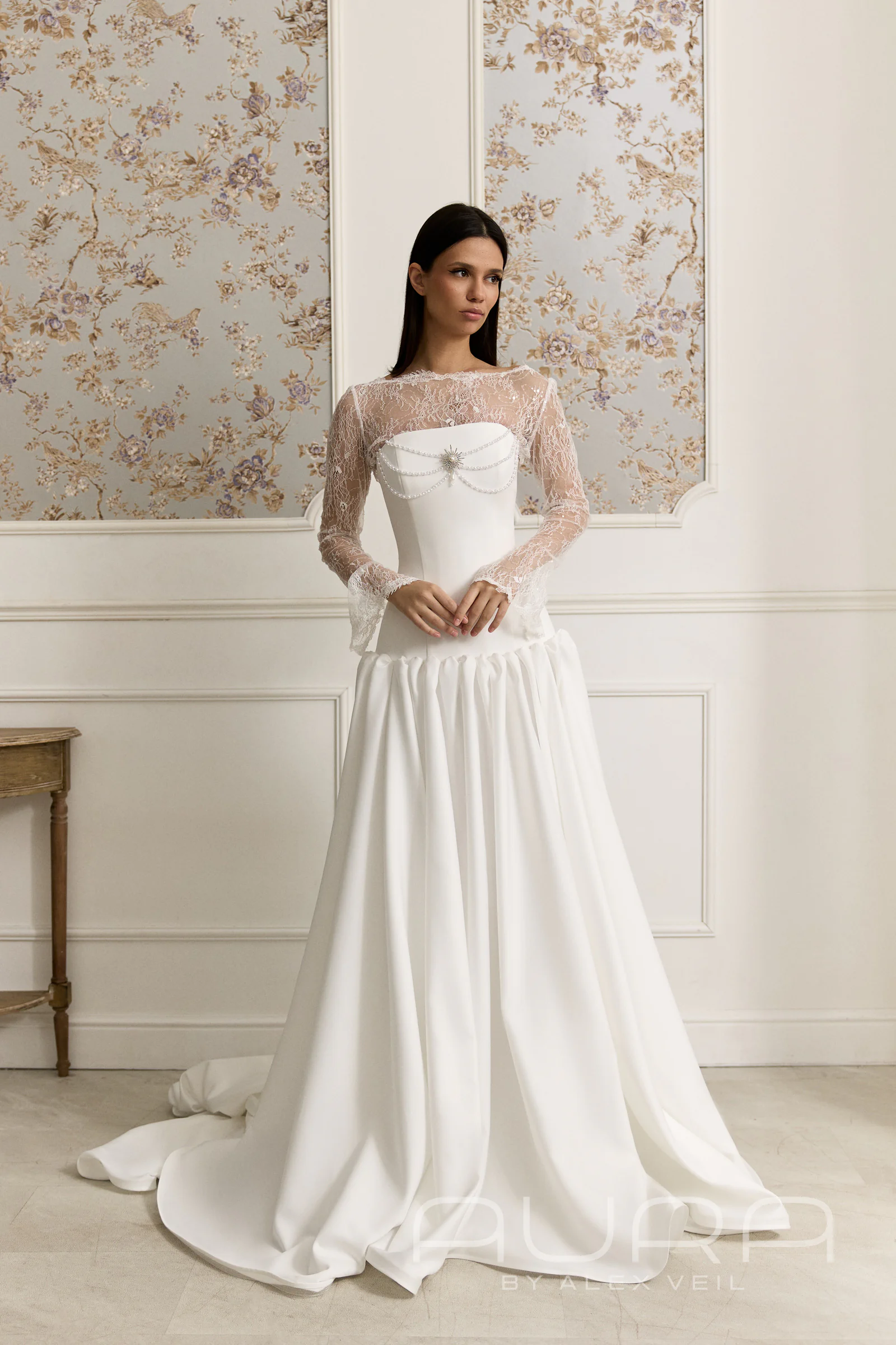 - Изысканная многослойность. Главная «фишка» образа — кружевное болеро с длинными рукавами и закрытой спинкой, которое надевается под корсет. Этот редкий дизайнерский прием создает эффект глубины и делает наряд визуально сложнее и интереснее, чем обычное закрытое платье.