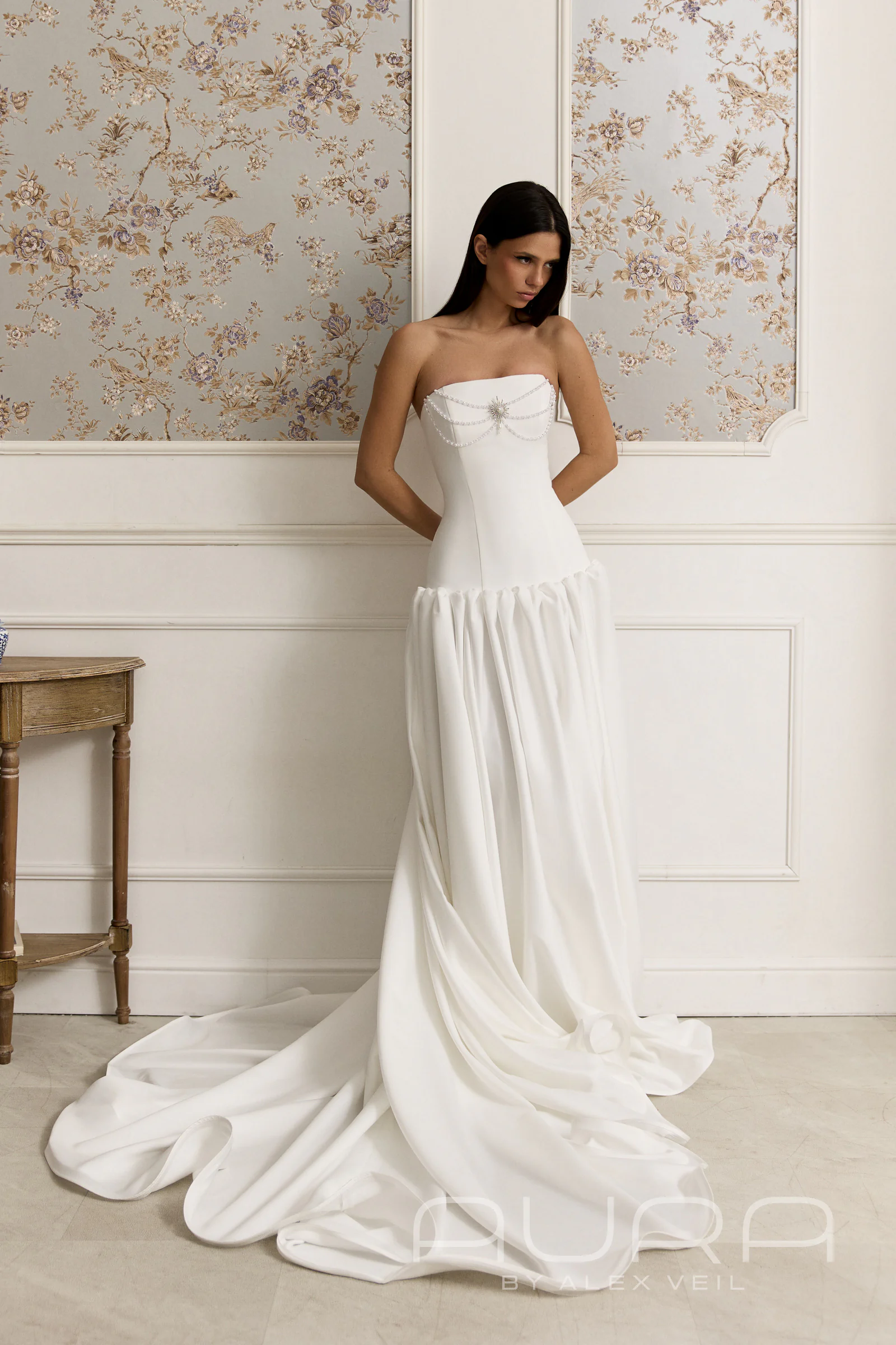 - Ювелирный декор. Нити из кристаллов алмазной огранки и жемчужных бусин выложены в форме драгоценного колье, а акцентная брошь-звезда по центру завершает композицию. Такой декор полностью исключает необходимость в украшениях на шею.