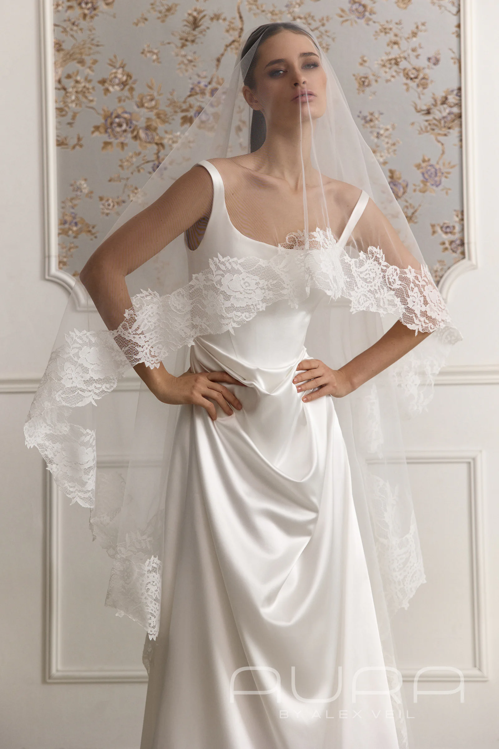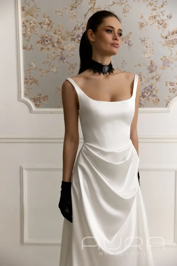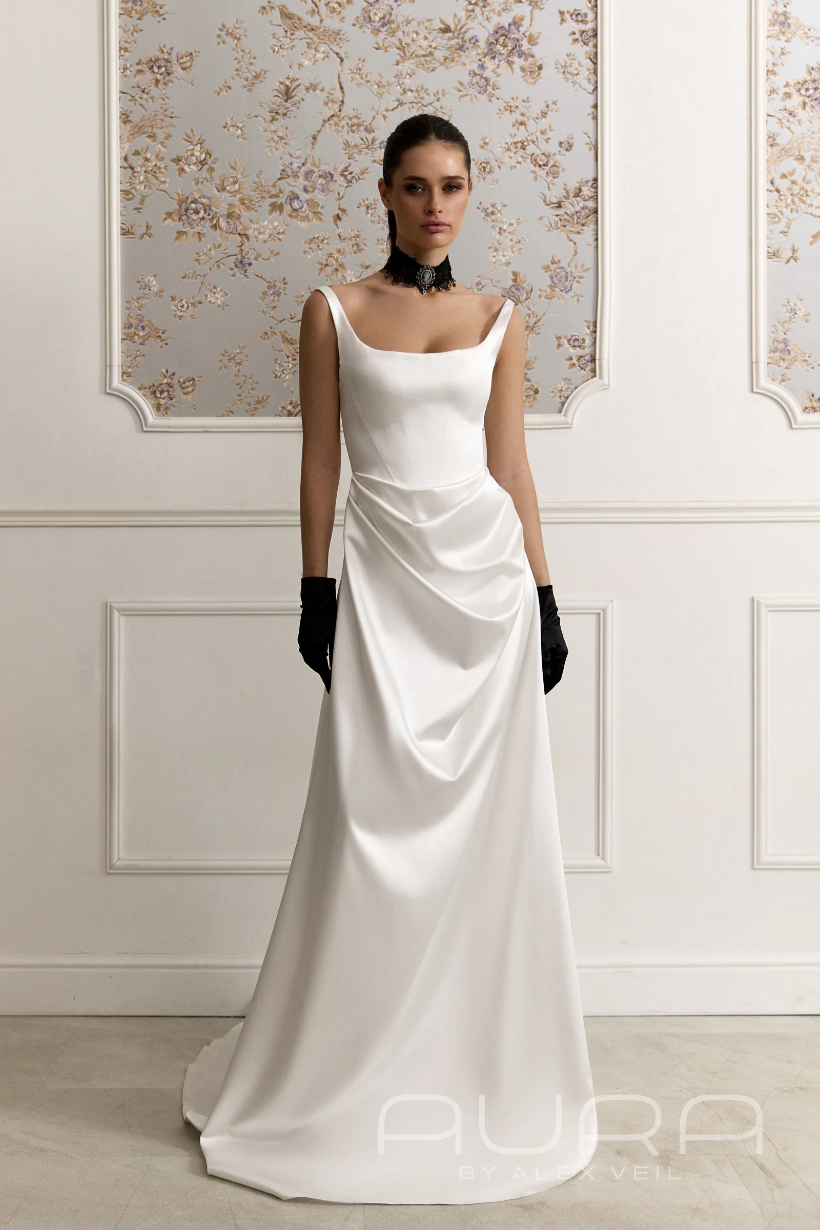 Минималистичное свадебное платье ‘Blake’ — это воплощение тренда на «чистую» роскошь и эстетику Old Hollywood. Здесь нет отвлекающего декора, главную роль играют безупречный крой и благородное жемчужное мерцание атласа.