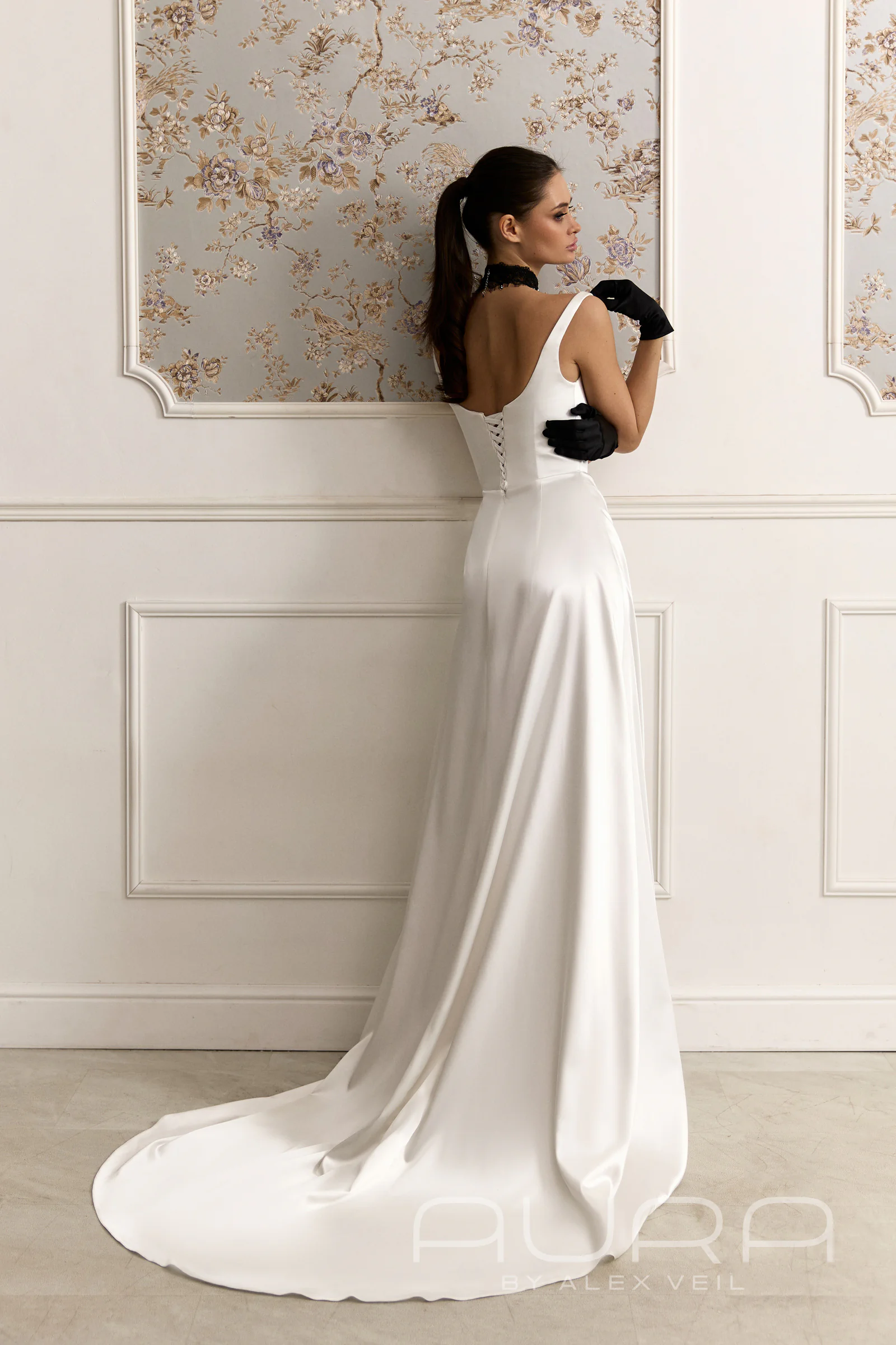 Платье ‘Blake’ станет прекрасным выбором для стильной камерной свадьбы или торжества в эстетике современного минимализма.