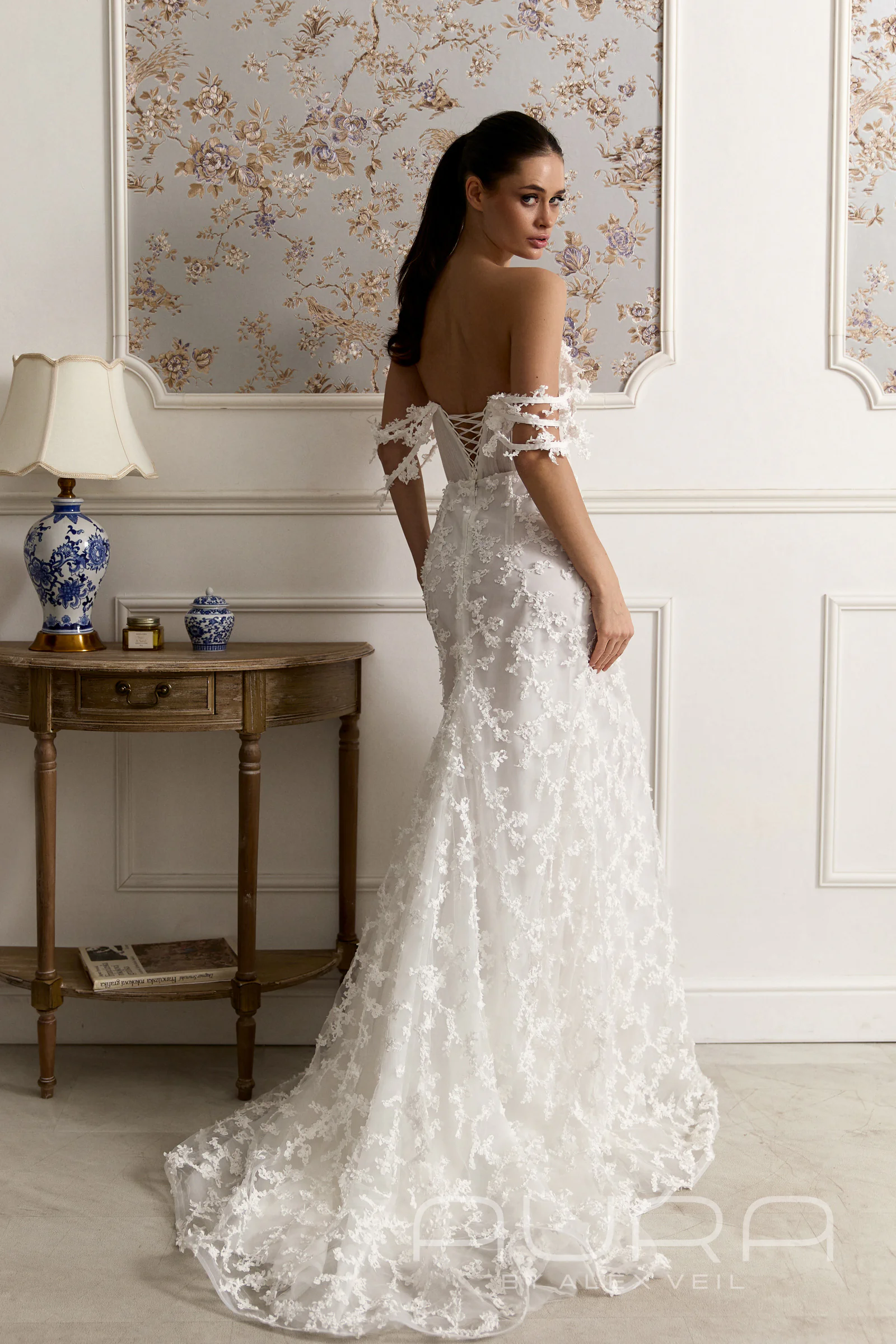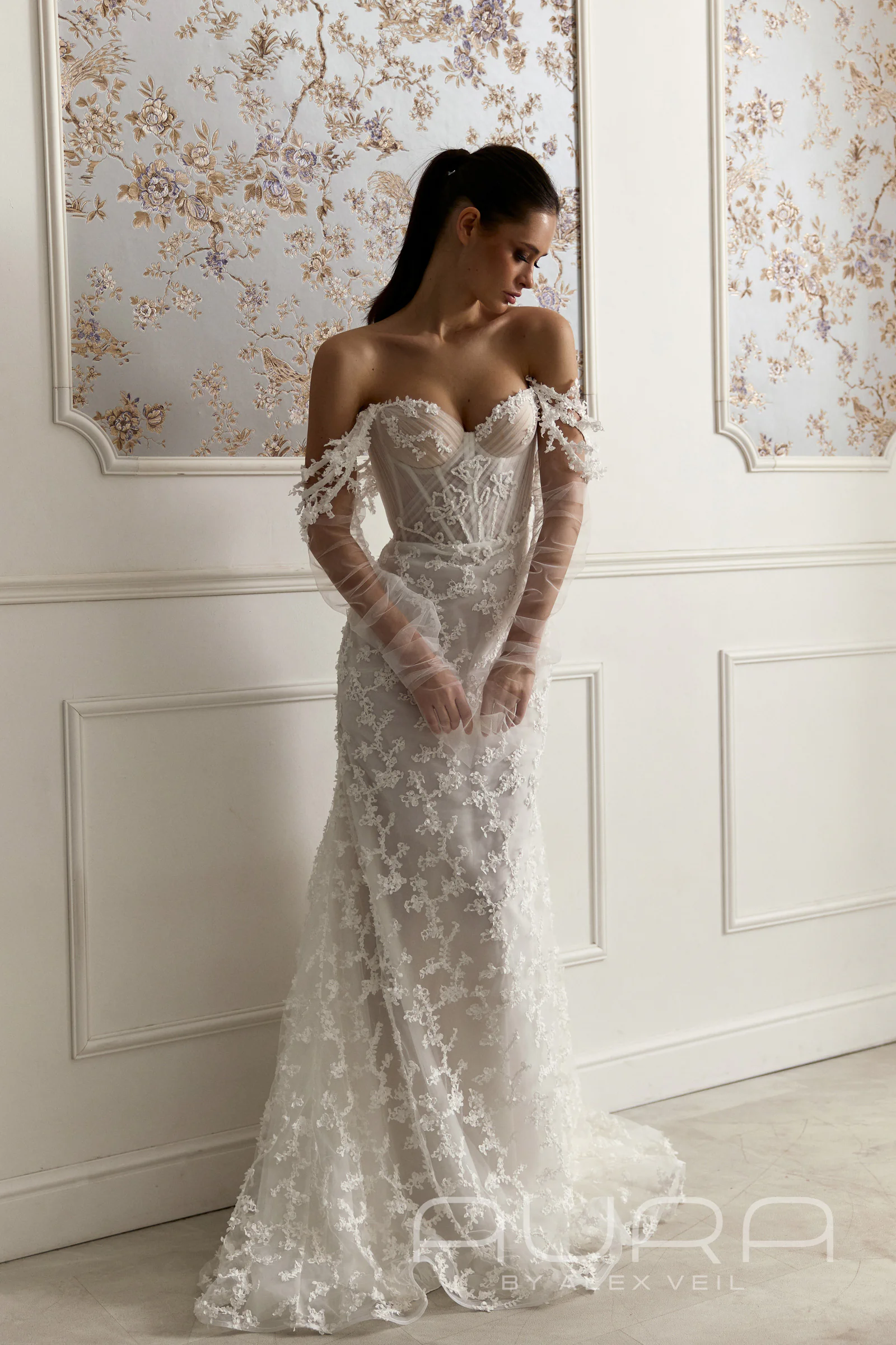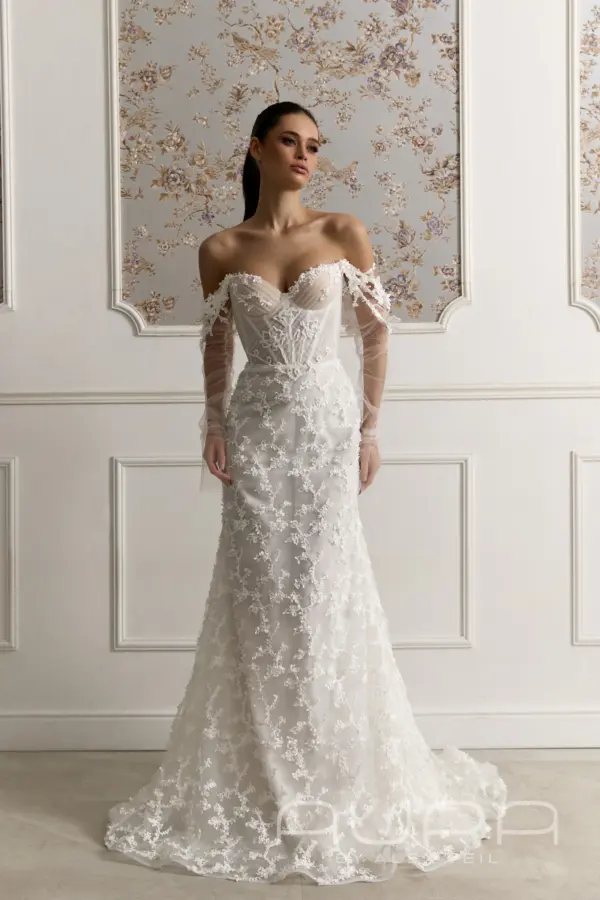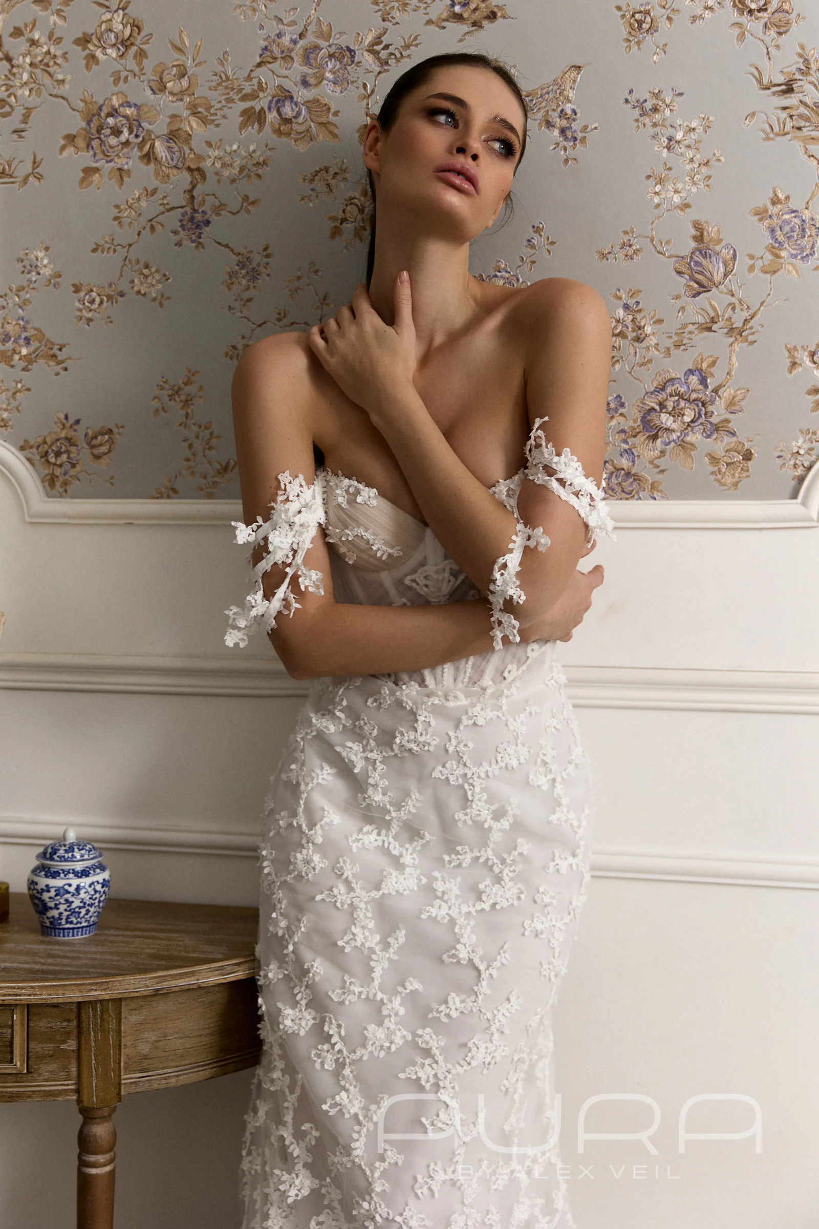- Стильный аксессуар: образ дополняют съемные фатиновые рукава-перчатки, один из горячих трендов свадебной моды нового сезона. Они добавляют образу драматичности и богемного шика, но при этом оставляют плечи открытыми, подчеркивая их изящество.