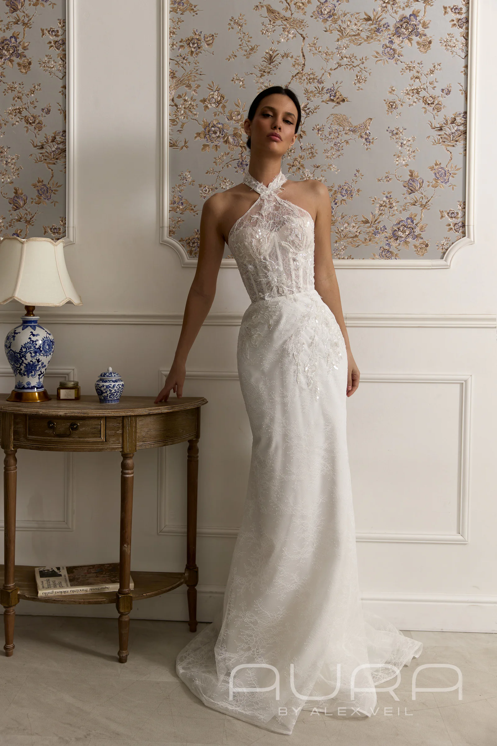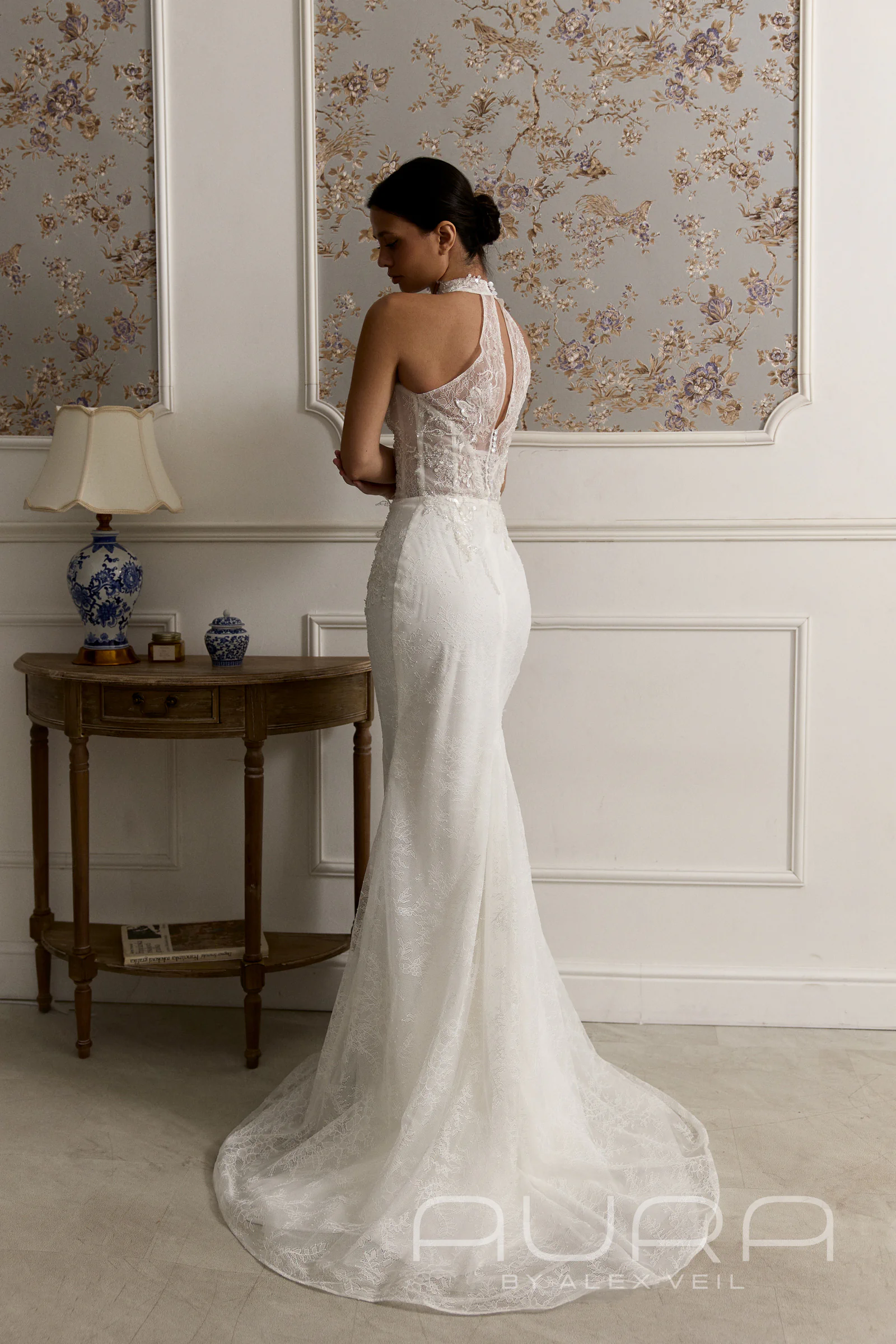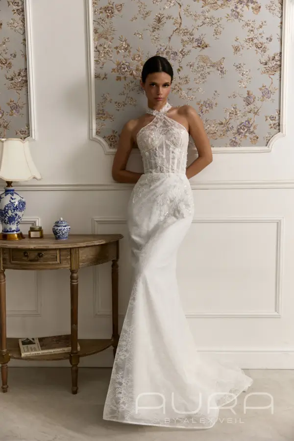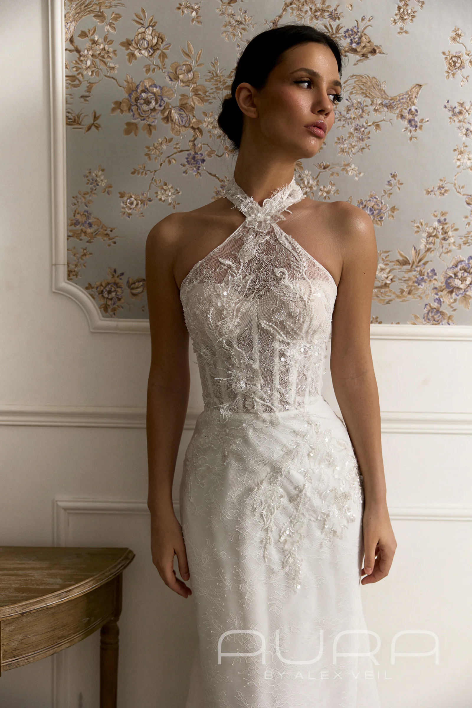 Платье-«рыбка» Loretta с верхом в стиле «американка» (halter neck) создает статный, вытянутый силуэт, который выглядит дорого и актуально вне времени.