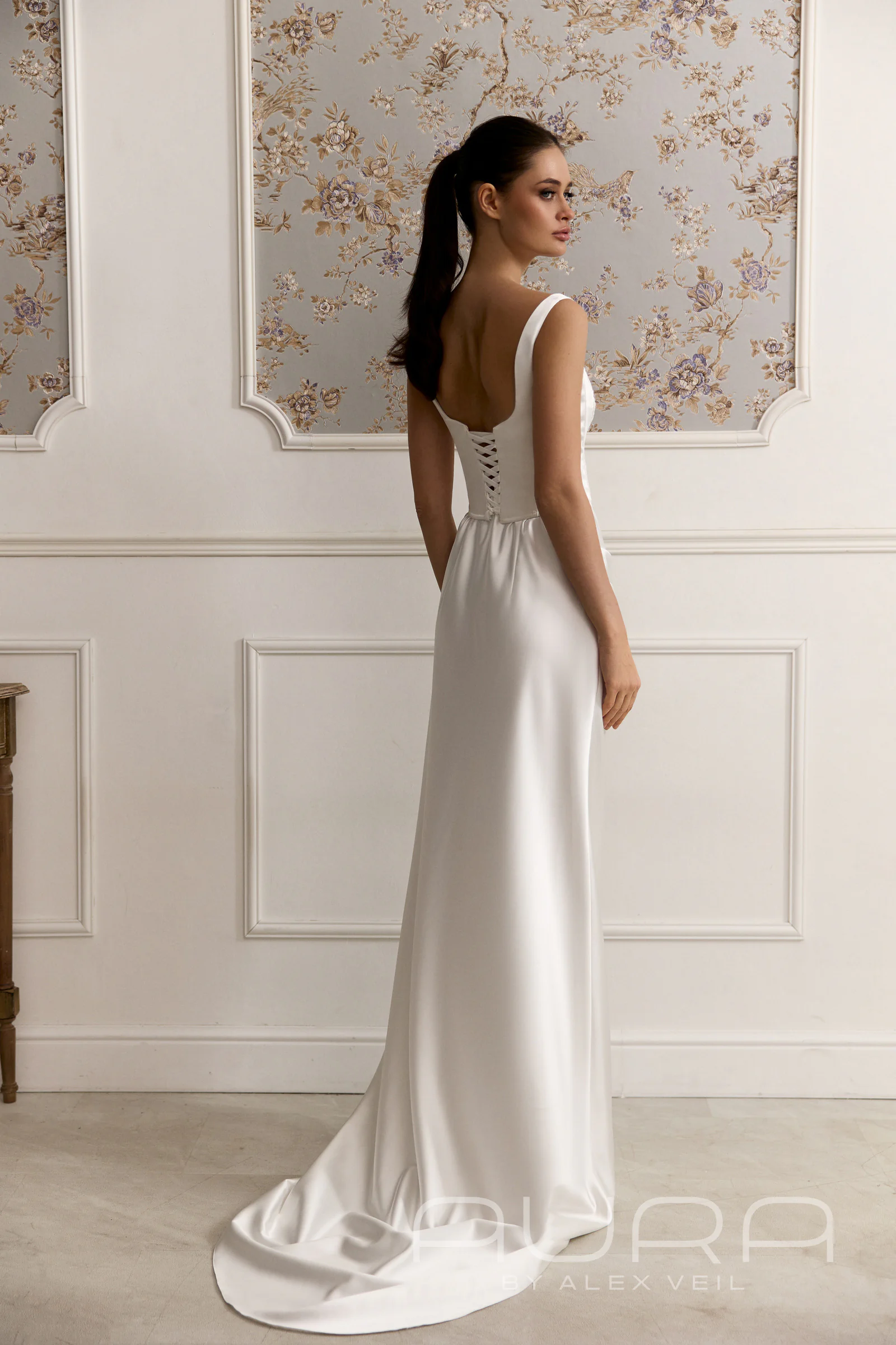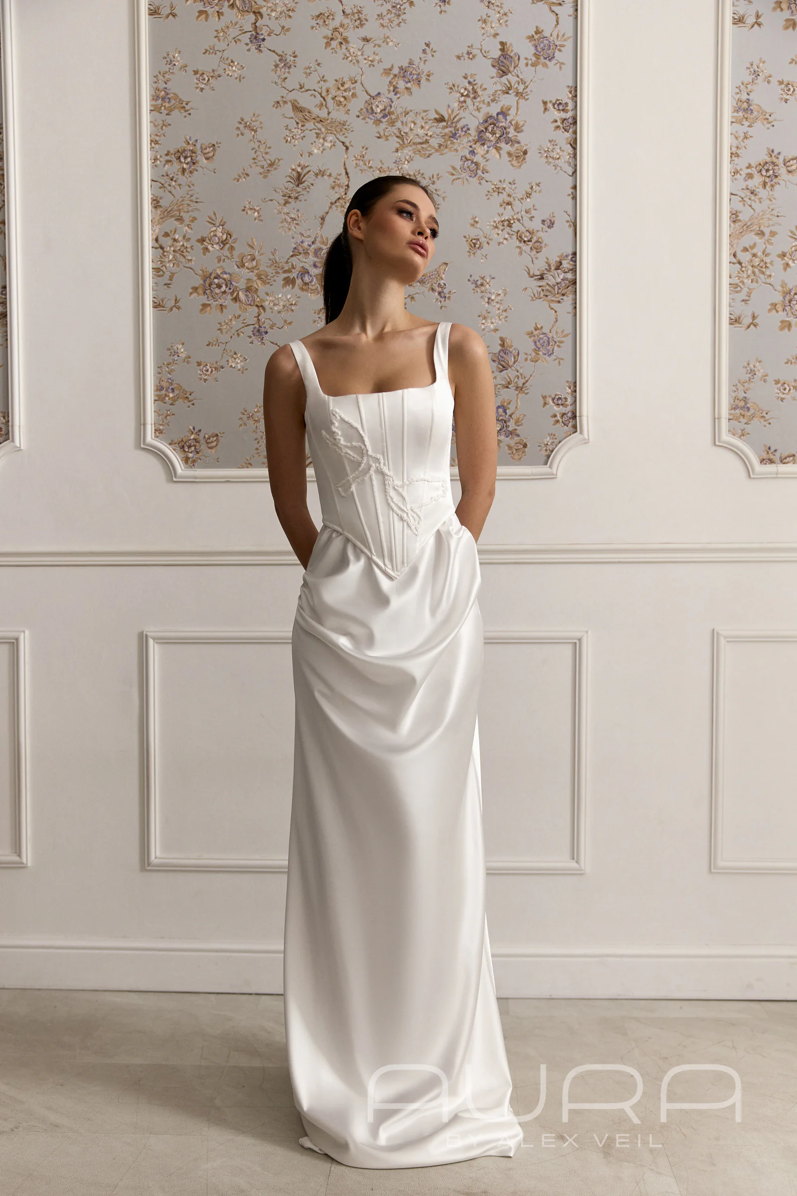 Свадебное платье ‘Polly’ в силуэте «рыбка» — это выражение романтики минимализма. Модель идеально вписывается в тренд на «смысловую» моду, где за лаконичным кроем скрывается глубокая идея. Ничего лишнего, только благородное мерцание атласа и детали, которые хочется разгадывать.