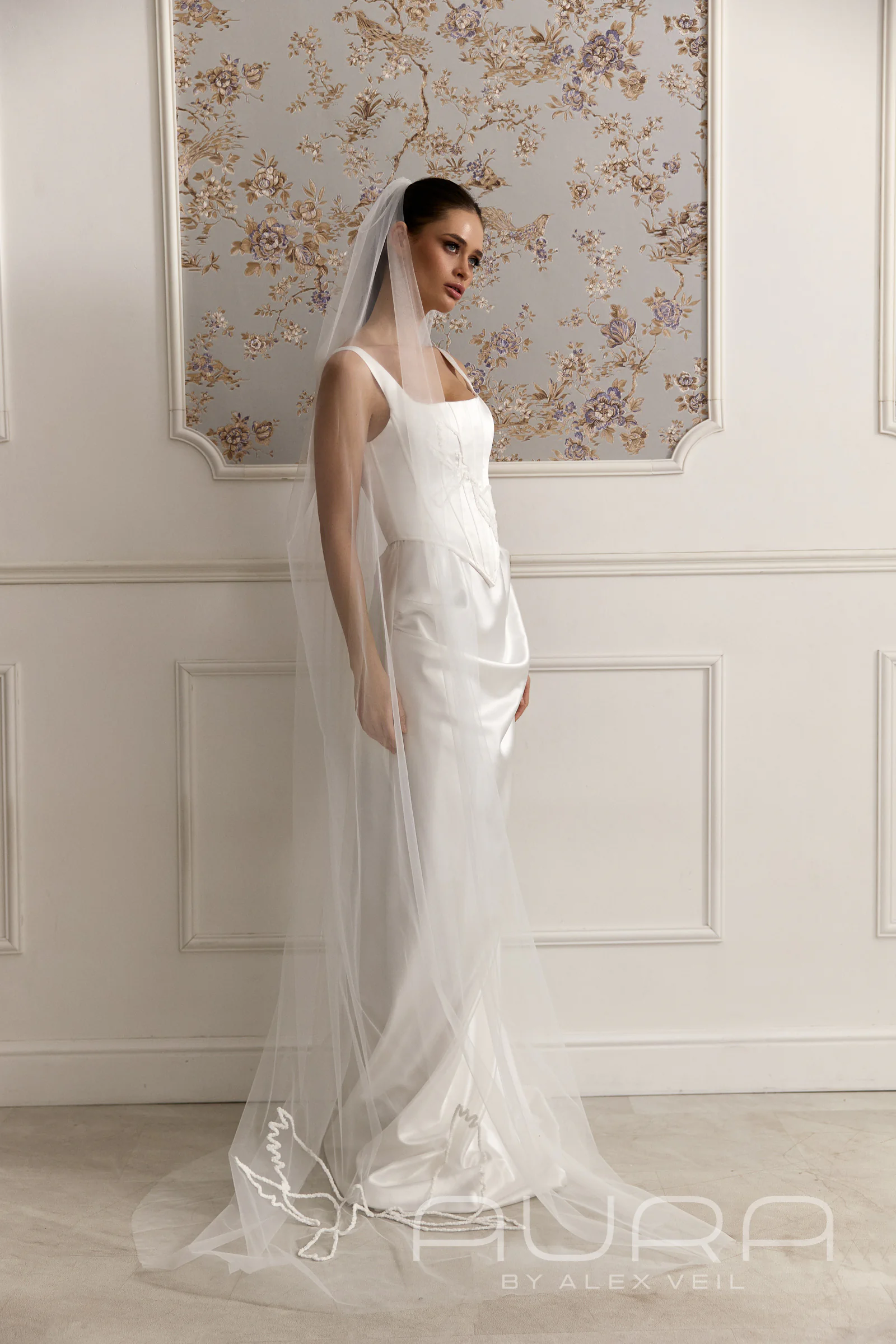 Завершая образ: платье можно (и нужно!) дополнить фатой с аналогично вышитым рисунком. Это свяжет образ воедино и добавит ему торжественности.