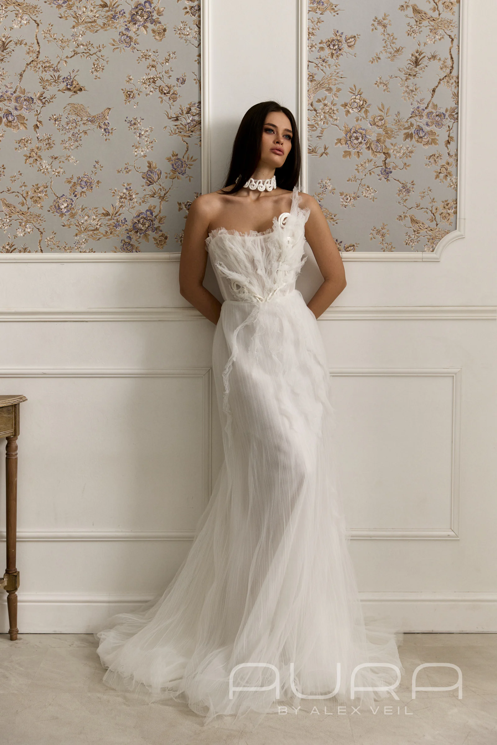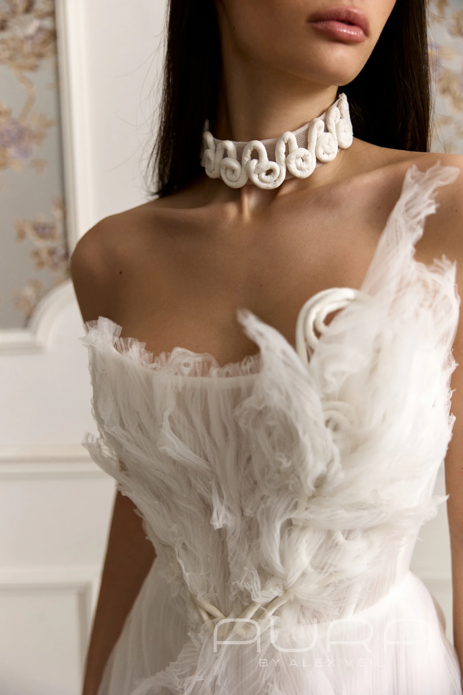 Дерзкое, трендовое платье ‘Priscilla’ — это выбор для невесты, которая видит моду как искусство. В этой модели привычный фатин обретает новое, архитектурное звучание. Платье переосмысляет классический силуэт «рыбка», прилагая у нему кутюрную смелость и сложную геометрию.