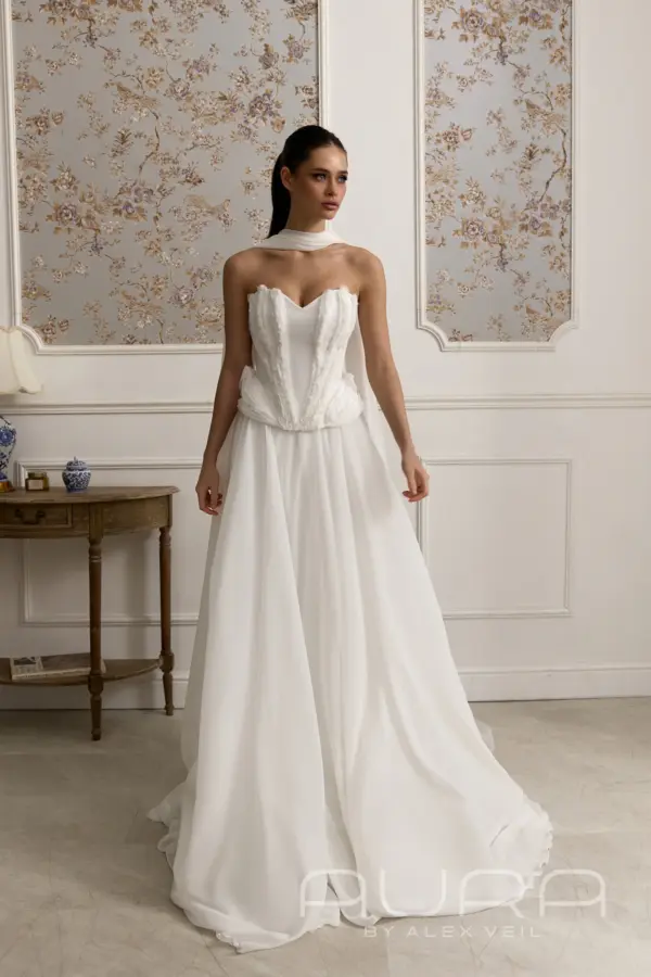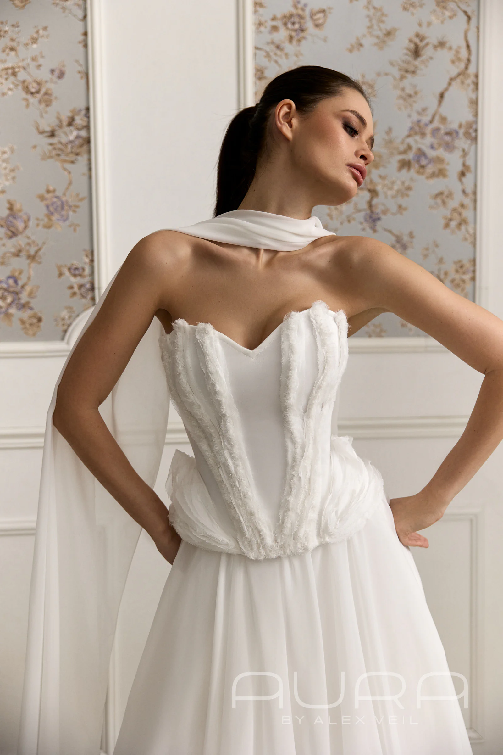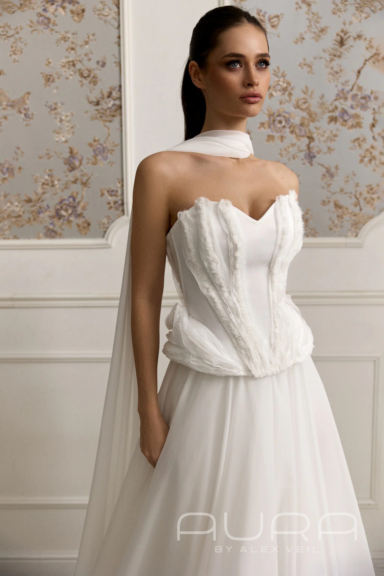 - Мягкая фактура. Вместо страз и блеска здесь используется игра ткани. Корсет украшен вертикальными акцентными полосками и легкими шифоновыми воланами, которые добавляют образу тактильности.