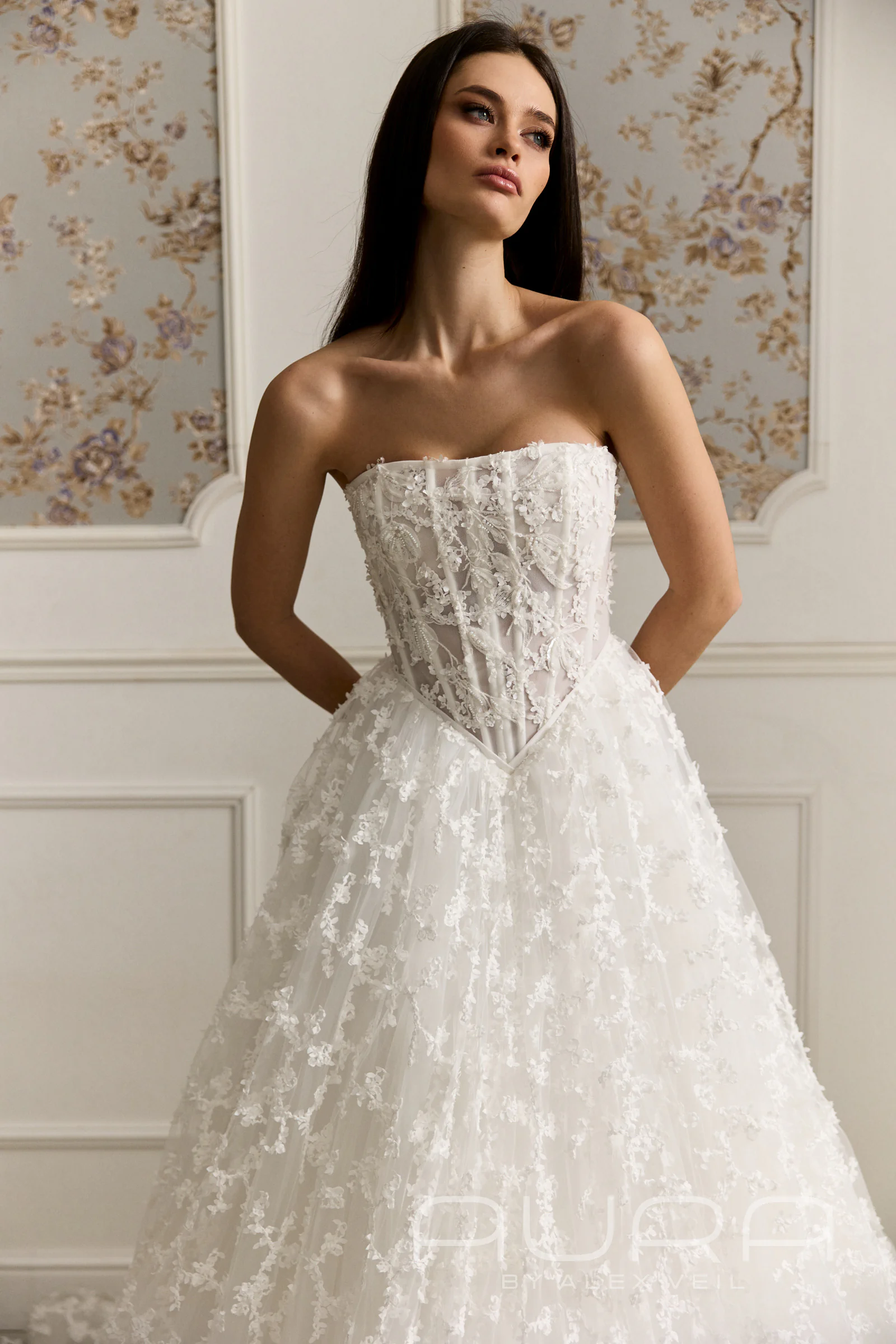 - Многослойность декора: узорный корсет дополнительно украшен объемными 3D-цветами и бисерной вышивкой. Такой прием создает эффект глубины и делает портретную зону невероятно выразительной.