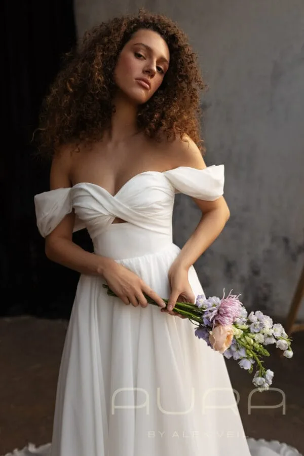 Невероятно стильное, современное свадебное платье в стиле утонченного минимализма. Очень легкое, выполнено из деликатного струящегося шифона. Верх платья — оригинальный и очень комфортный корсет, который прекрасно формирует и подчеркивает силуэт, но при этом не стесняет движения.
