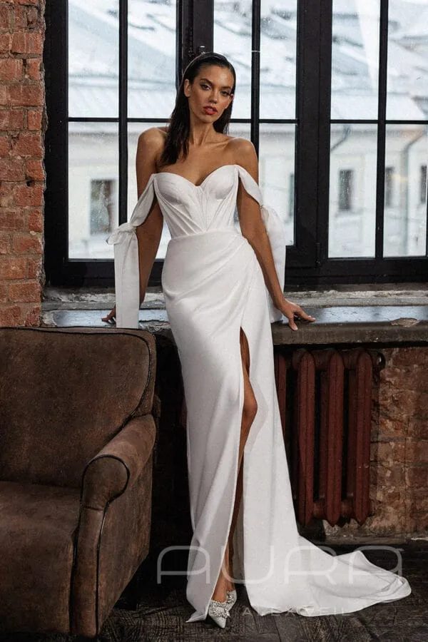 Стильное прямое свадебное платье с разрезом, выполнено из легкого струящегося атласа. Рукава-лямки завязываются на изящный бант в произвольной форме.